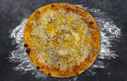 rajčata, sýr, šunka, kuřecí maso, kukuřice, quattro formaggio