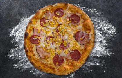 rajčata, sýr, salám, slanina, cibule, kukuřice